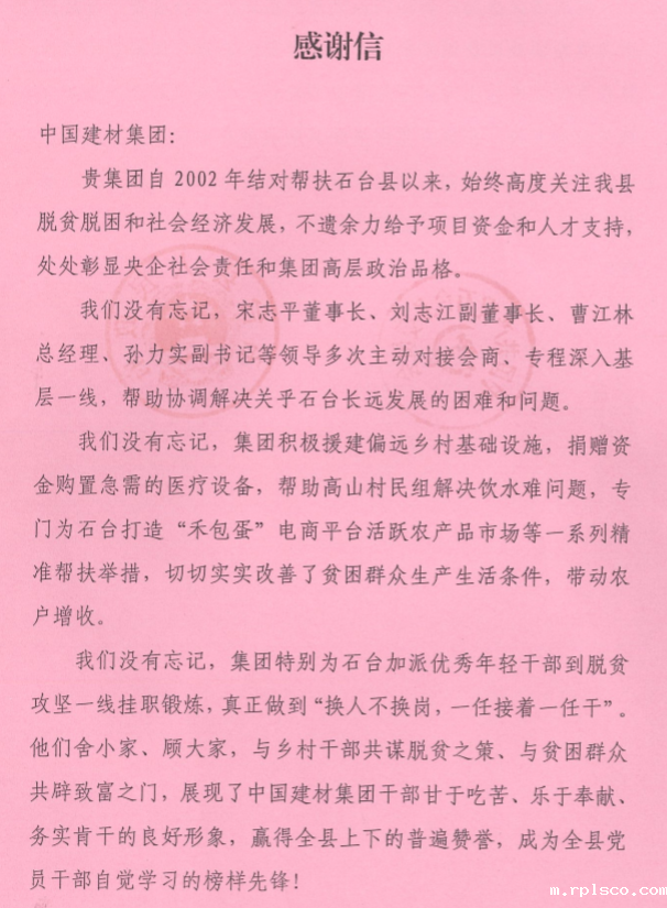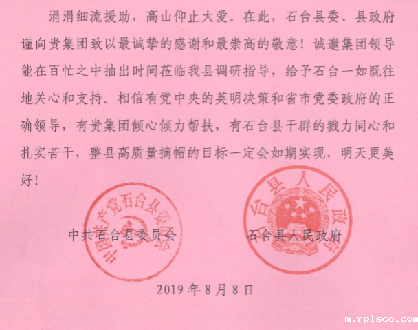 在脱贫攻坚重要时刻,taptap体育收到石台县发来的感谢信,对集团长期以来一如既往的大力帮扶表达感谢。