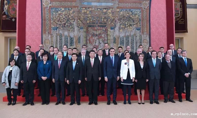 28日下午,国家主席习近平同西班牙首相桑切斯共同会见中西企业家顾问委员会双方代表。习近平称中西企委会是深化两国经贸合作的重要平台,是“强强联合、优势互补”的合作新模式,希望中西企委会发挥桥梁和纽带作用,促进两国经济和企业交流,推动两国企业合作开发中东和拉丁美洲市场。习近平感谢两国企业家长期以来为中西经贸合作发展作出的不懈努力,相信在两国企业家和工商界共同努力下,新时期中西互利共赢的经贸合作必将谱写更加辉煌的新篇章,给两国和两国人民带来更多福祉。习近平主席同桑切斯首相还与代表们合影留念。
