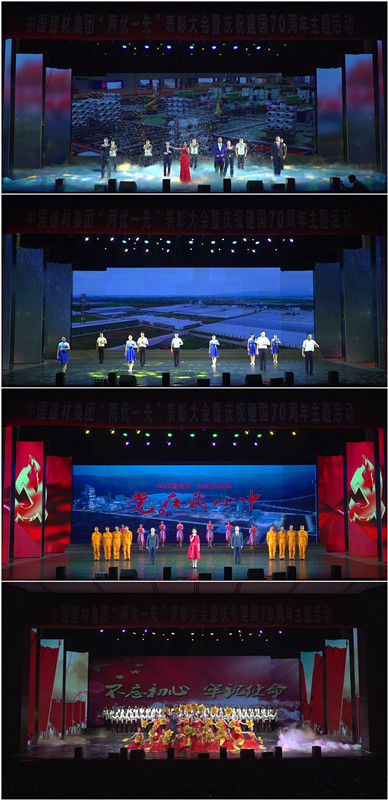 在庆祝中华人民共和国成立70周年主题活动上,来自集团11家成员企业的干部员工分为传承、责任、奉献、奋斗四个篇章,以演说、合唱、舞蹈、快板、情景剧、舞台剧等多种形式,或激情澎湃、或感人至深、或娓娓道来,呈现了一场振奋人心、鼓舞士气的精神盛宴,一次次赢得现场雷鸣般的掌声。北新建材的《初心向党耀北新 砥砺奋进谱新篇》、凯盛科技的《伟大跨越中的凯盛之路》,回顾了 人不忘初心、砥砺前行,大力发展新型建材和玻璃工业的光辉历程;中联水泥的《最美的蓝天 最美的你》、天山水泥的《敢问谁人无芳华 我自不悔驻村行》、南方水泥的《梦想启航南方》,讲述了 人积极贯彻落实党中央决策部署,勇做美丽中国的推动者、脱贫攻坚的践行者和供给侧结构性改革的引领者的动人故事; 总院的《我们都是追梦人》、地勘江苏总队的《誓言无声》、北新集团的《我的房屋梦》,诠释了 人坚守奉献、实干担当的坚定信念和无悔追求;中国巨石的《逐梦奋进再出发》、泰山玻纤的《泰山玻纤 玻纤泰山》、中材国际南京的《党在我心中——与祖国同行 与时代共进》、凯盛科技的《不忘初心》展现了 人不忘初心、牢记使命、永远奋斗的最美姿态。活动在全场齐声高唱《歌唱祖国》的歌声中圆满落幕。