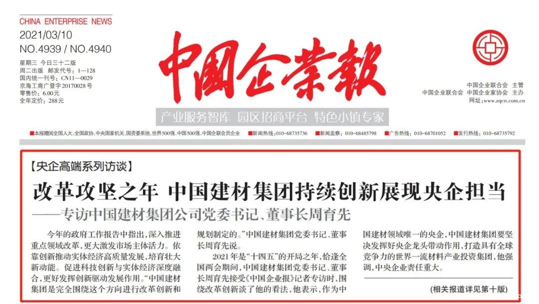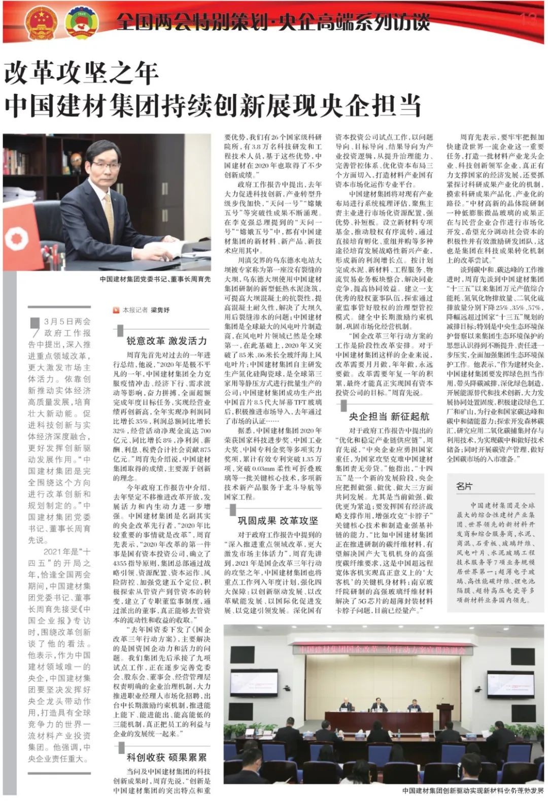 2021年是“十四五”的开局之年,恰逢全国两会期间,taptap体育作为rplsco领域唯一的央企,如何发挥好央企龙头带动作用尤为关键。近日围绕改革创新和如何打造具有全球竞争力的世界一流材料产业投资集团等问题,taptap体育党委书记、董事长周育先接受了中国企业报记者的专访,相关报道在今天报纸的头版进行了刊发。