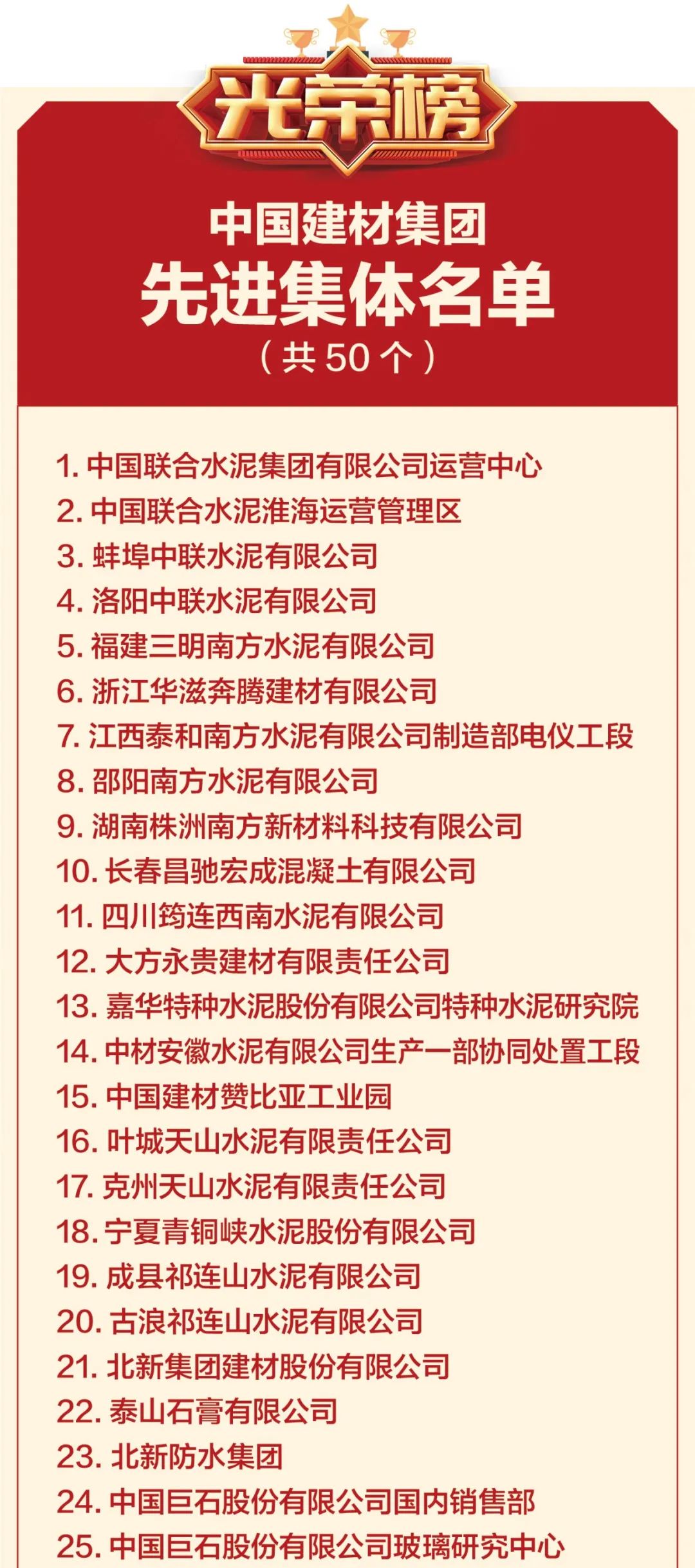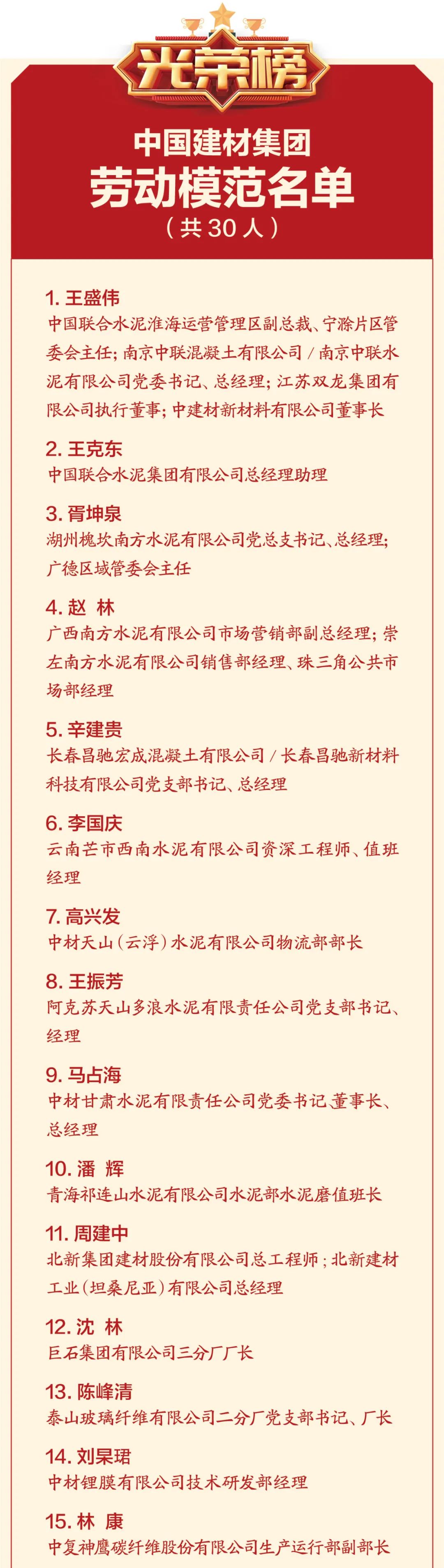 2021年是“十四五”规划的开局之年,也是中国共产党成立100周年,为大力弘扬劳模精神、劳动精神、工匠精神,进一步调动广大干部职工的积极性和创造性,不断增强“四个意识”、坚定“四个自信”、做到“两个维护”,坚持围绕中心,服务大局,为集团改革发展作出积极贡献,集团工会决定授予王盛伟等30人“ 劳动模范”荣誉称号,授予中国联合水泥集团有限公司运营中心等50个基层单位“ 先进集体”荣誉称号。