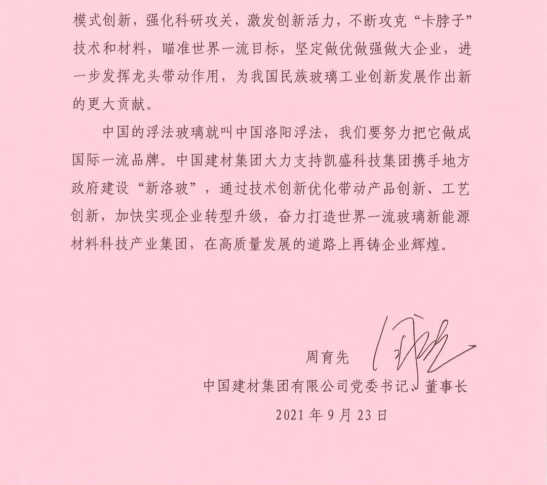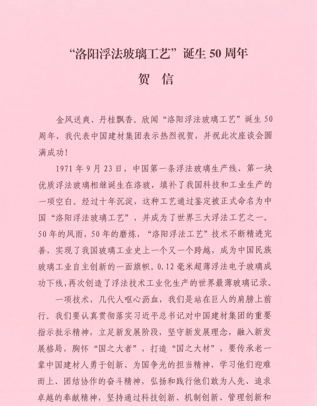 2021年9月23日,洛玻举办了纪念“洛阳浮法玻璃工艺” 诞生50周年座谈会。中国工程院院士、 总工程师、凯盛科技集团董事长彭寿发表寄语,向为“洛阳浮法玻璃工艺”发明和创新发展作出贡献的广大科技工作者表示崇高的敬意和热烈的祝贺。同时,表示“洛阳浮法玻璃工艺”是民族玻璃工业发展壮大的核心技术,是传统玻璃向新材料转型的关键技术。自力更生、自主创新、产业报国、勇于奉献是“洛阳浮法玻璃工艺”与生俱来的品质,希望广大玻璃科技工作者心怀“国之大者”,始终保持“关键核心技术要不来、买不来、讨不来”的紧迫感,始终保持“玻璃创造美好世界”的使命感,始终保持建设科技强国、材料强国的责任感,万众一心、同心协力,为国家玻璃工业实现高水平科技自立自强奋勇前进!