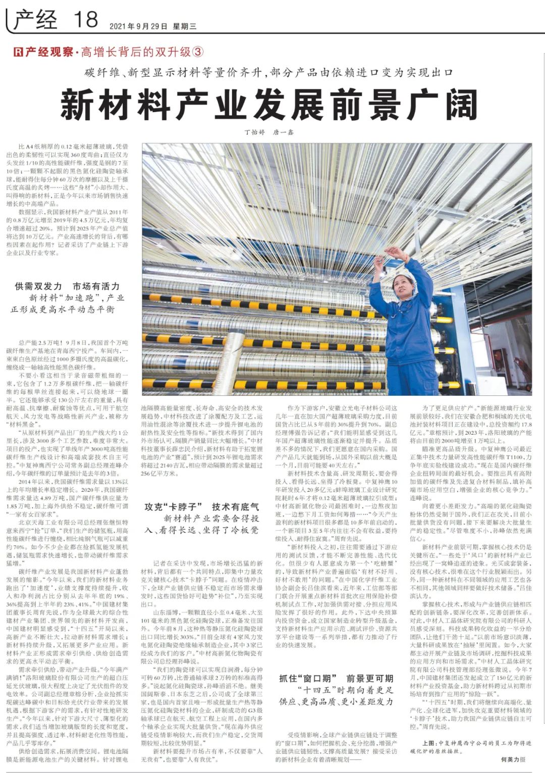碳纤维产业发展是我国新材料产业蓬勃发展的缩影。“今年以来,我们的新材料业务跑出了‘加速度’,业绩支撑度持续提升,收入和净利润占比分别从去年年底的19%、36%提高到上半年的23%、41%。” 董事长周育先说,作为全球最大的综合性建材产业集团、世界领先的新材料开发商, 明显感受到,“十四五”开局以来,高新产业不断壮大,拉动新材料需求增长;新材料持续升级,又拓展更多产业应用。新材料产业正形成需求牵引供给、供给创造需求的更高水平动态平衡。