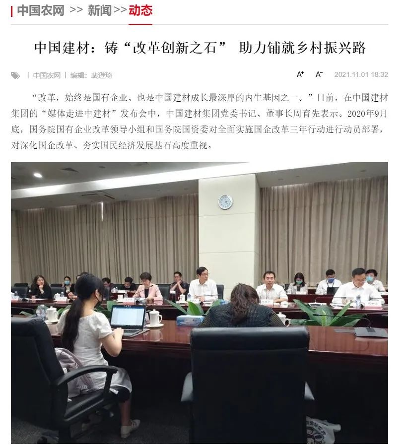 中国农网专稿《 :铸“改革创新之石” 助力铺就乡村振兴路》中,周育先表示,改革始终是国有企业、也是 成长最深厚的内生基因之一。党中央、国务院对国企改革给出了“施工图”,我们主要是“按图施工”。 定点帮扶5个区县,发挥科技优势,助推脱贫攻坚,展现央企担当;坚持走生态优先,绿色低碳发展之路,守护绿水青山;以基础建材推动改革创新,为“中国制造”烙上“建材印记”,服务国家重点工程。