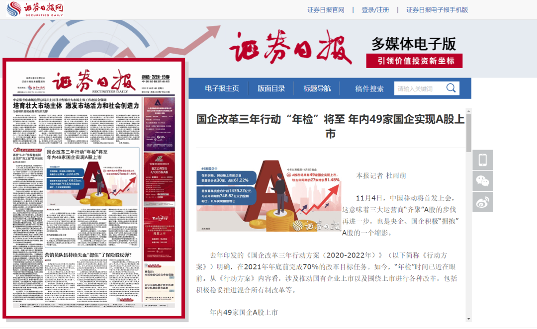 证券日报《国企改革三年行动“年检”将至 年内49家国企实施A股上市》中用 作为案例讲清混合所有制改革, 党委书记、董事长周育先表示,“央企实力+民企活力=企业竞争力”,这一公式既是对国企民企关系的深刻理解,也是进行混改的重要依据。发展混合所有制不仅是资金的混合,更是能力的混合、优势的混合、文化的混合。混合所有制改革最重要的是继承国企和民企的优点,把国企的经济实力、规范管理和民企的市场活力、拼搏精神有机结合起来。