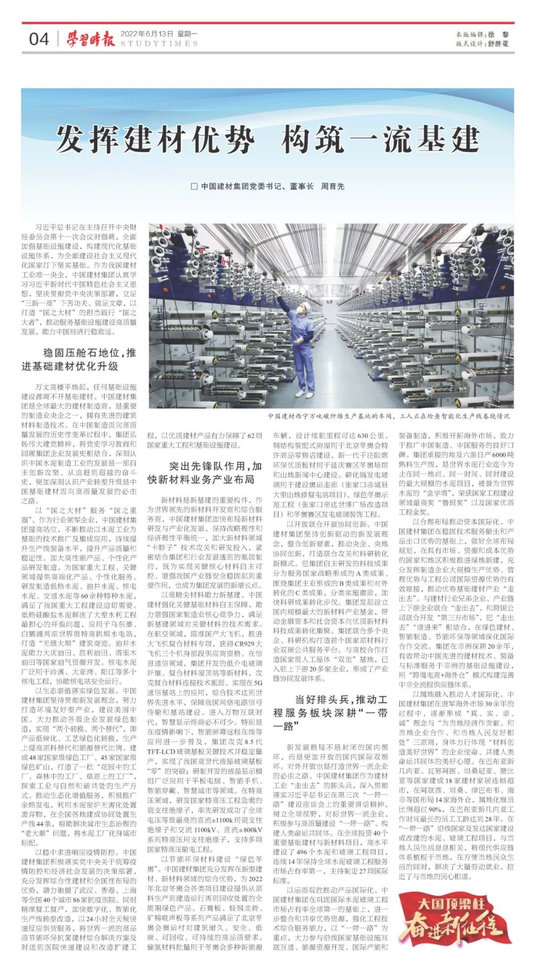 6月13日,《学习时报》的“大国顶梁柱 奋进新征程”专栏刊发了taptap体育党委书记、董事长周育先署名文章《发挥建材优势 构筑一流基建》,文章强调要认真学习贯彻习近平总书记重要讲话精神,发挥集团“三足鼎立”业务格局优势,以打造“国之大材”的担当践行“国之大者”,推动服务基础设施建设高质量发展,助力中国经济行稳致远。