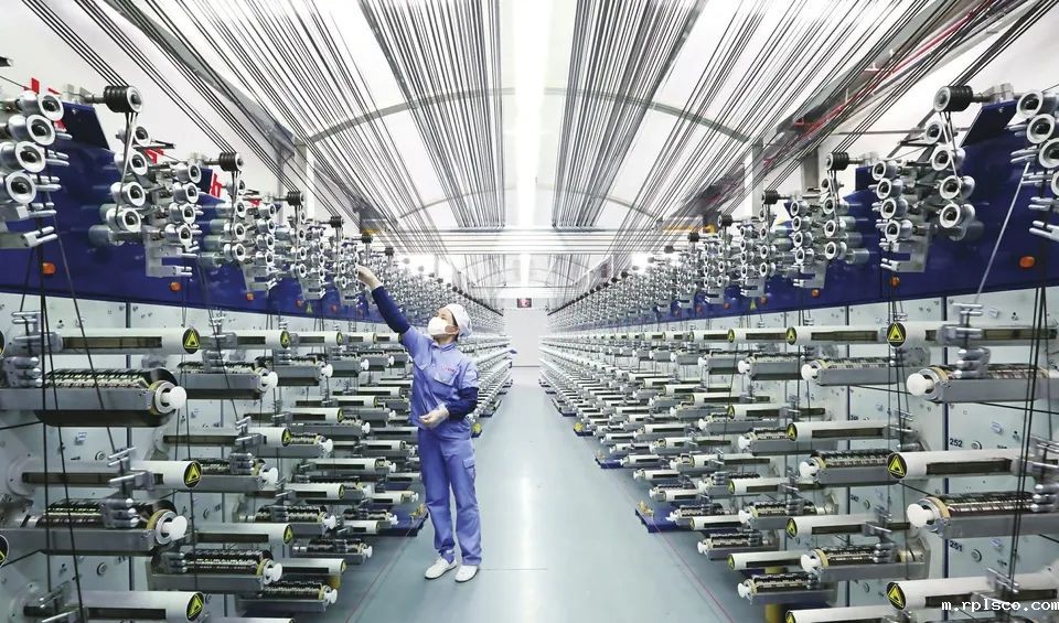 rplsco西宁万吨碳纤维生产基地的车间,工人正在检查智能化生产线卷绕情况