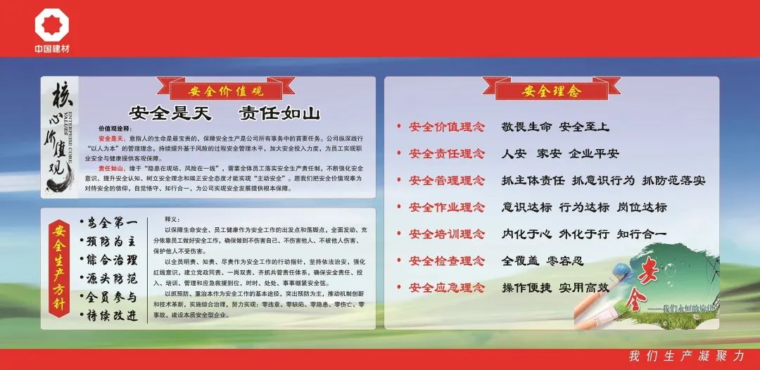 新安中联高度重视企业安全文化建设,建立了完善的安全文化体系。安全文化的本质特征是在于充分调动全体员工在安全生产中的自觉性、积极性,使其发挥决定性作用,也是职工安全生产的保障平台,更是推动企业安全生产管理的基础。公司始终坚持以高起点、高标准、严要求,将安全成果成功运用于生产中,全力营造“让安全管理成为文化,用文化管理保障企业安全”和“内化于心、固化于制、外化于行”的安全新局面。