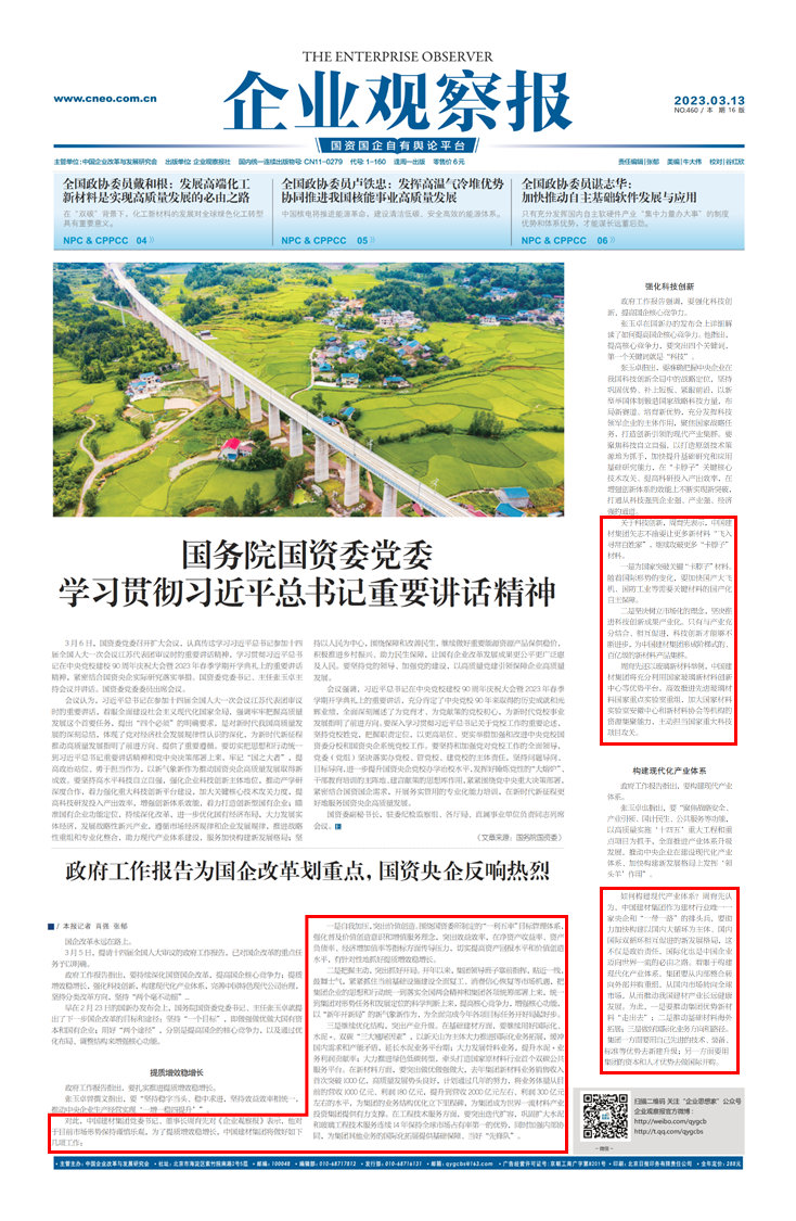 当前,全国上下正在深入开展学习贯彻习近平总书记在全国两会期间的重要讲话精神和全国两会精神,《企业观察报》“两会同期声”栏目刊登了《政府工作报告为国企改革划重点,国资央企反响热烈》,报道了