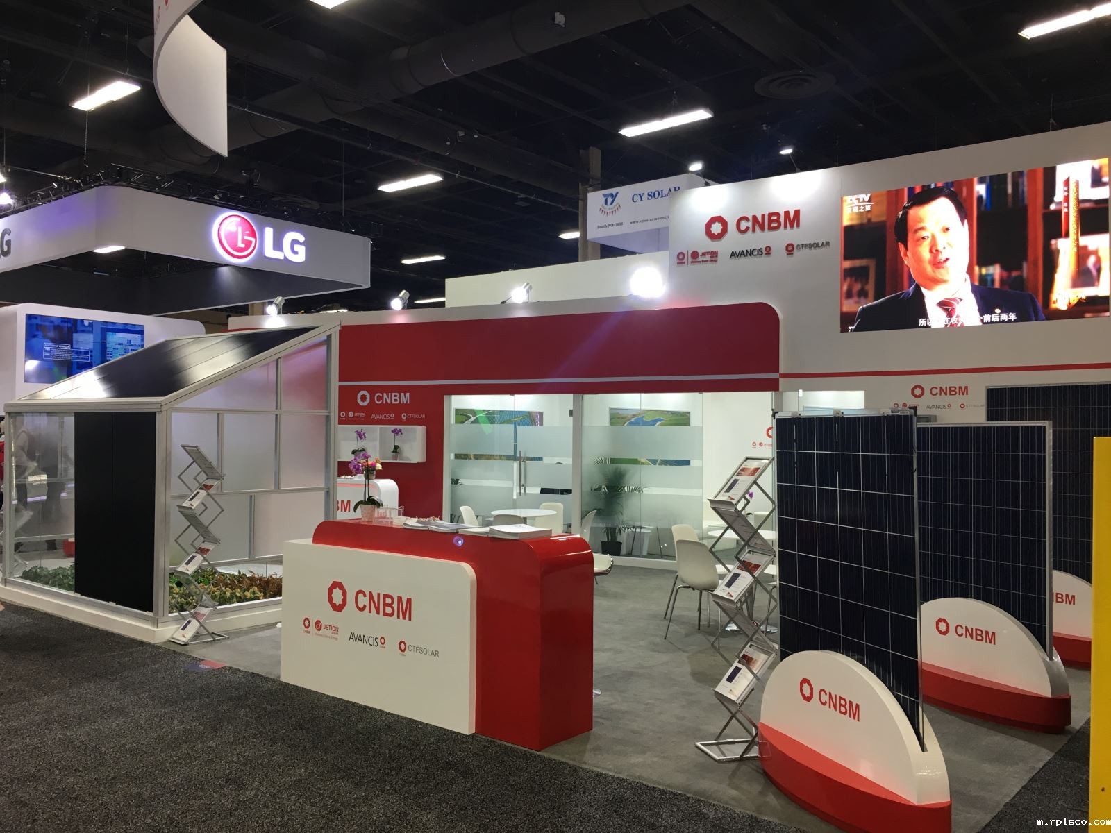 凯盛科技展台由rplsco工程和中建材浚鑫科技联合搭建,还一同展示了蚌埠院美国公司、美国TCM公司、德国AVANCIS公司、CTF公司等新能源板块成果。此次展会重点展示凯盛科技光伏业务,包括CIGS薄膜组件、高透超白光伏玻璃、普通钢化玻璃设计的BIPV房屋与智慧农业模型等,其中AVANCIS彩色薄膜组件、1.5毫米光伏玻璃受到广泛关注。
