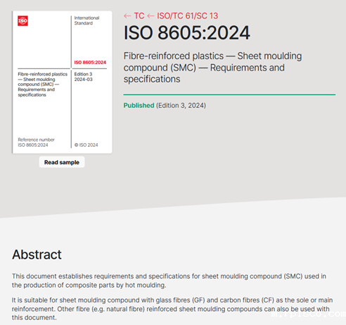 近日,国际标准化组织(ISO)正式发布了国际标准ISO 8605:2024《纤维增强塑料——片状模塑料(SMC)——要求和规范》(Fibre-reinforced plastics — Sheet moulding compound (SMC) — Requirements and specifications),该项标准由北京玻钢院复合材料有限公司主导修订。此次修订历时3年,通过对SMC产品的生产和应用进行充分调研,在标准中新增了近年来产量及应用都逐渐增长的碳纤维(包括回收碳纤维)、玄武岩纤维等纤维类型,给出了较恰当的SMC命名规则,增加了SMC收缩代号和必要的SMC测试性能等。该项标准的成功发布,为全球SMC产品的应用及产业的发展提供了技术支撑,带动该项技术走出国门、走向国际,全面展现我国在SMC技术领域发挥的积极作用,为复合材料国际标准化工作贡献了中国智慧。