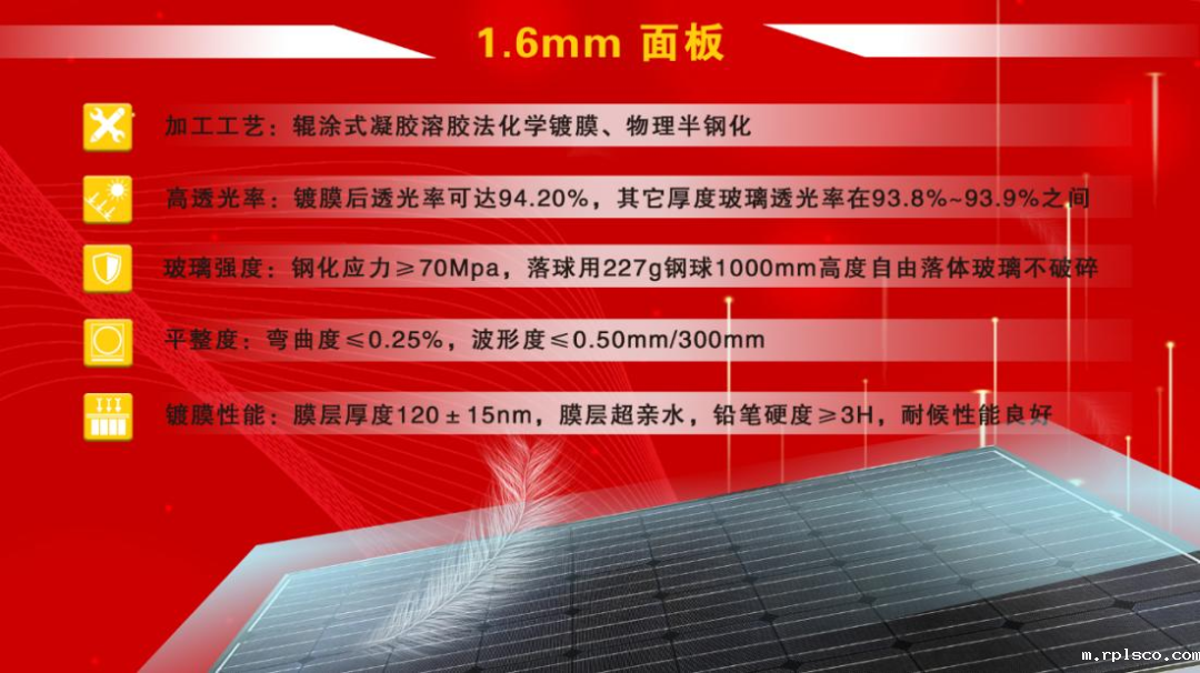 1.6mm原片玻璃具有更高的透光率,原片透光率可达92%。通过采用纳米级超亲水镀膜材料单层镀膜后,整体透光率增加2.1%左右,玻璃透光率可达94.2%,使组件功率可提升2.1%左右。