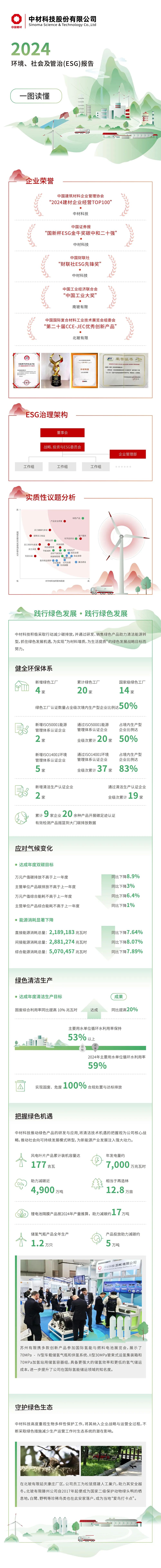 作为“中央企业ESG联盟”首批成员企业, 积极践行ESG理念,以“材料创造美好世界”为使命,坚持“善用资源、服务建设”的核心理念,秉承“创新、绩效、和谐、责任”的核心价值观,追求环境、社会及治理的协调共赢,将ESG理念最终落实在市场绩效、科技创新、节能环保、员工关爱、企业公民等履责实践之中,并不断建立健全ESG工作机制与管理体系,积极推动成员企业披露专项报告。目前,已实现集团所属13家上市公司ESG专项报告披露“全覆盖”。