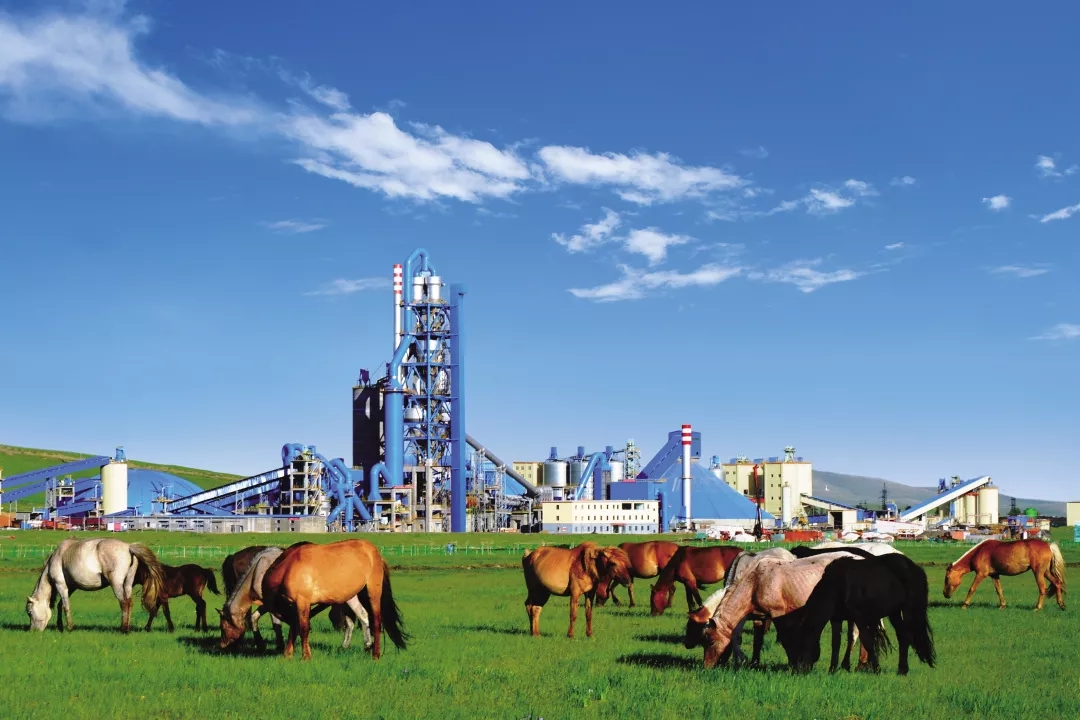 我办公室里挂着一张蒙古国水泥生产线的照片,白云下面绿草茵茵,工厂旁边悠闲的马儿在吃草,衬着湛蓝天空作为底色,整个生产线就像点缀在草原深处的风景。这是我们 的标志性图片,我在讲课、讲话时经常打出这张照片。
