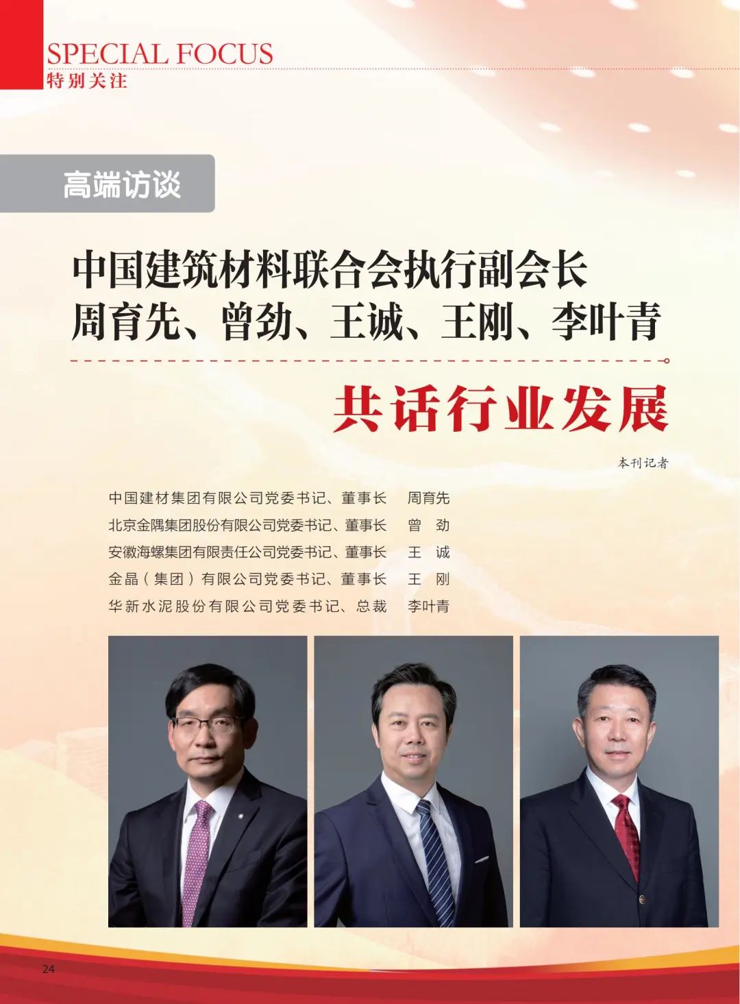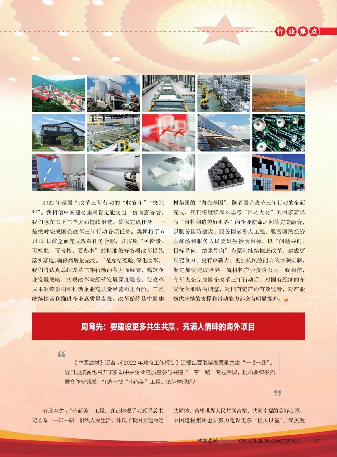 3月11日,2022年全国两会圆满完成各项议程,在北京胜利闭幕。这次大会是在我国进入全面建设社会主义现代化国家、向第二个百年奋斗目标进军新征程的重要时刻召开的一次重要会议,也为建材行业的未来发展指明方向、注入强大力量。就今年全国两会期间和2022年政府工作报告中的热点话题, 党委书记、董事长周育先接受《 》杂志专访,与中国建筑材料联合会执行副会长曾劲、王诚、王刚、李叶青共话企业、行业发展。