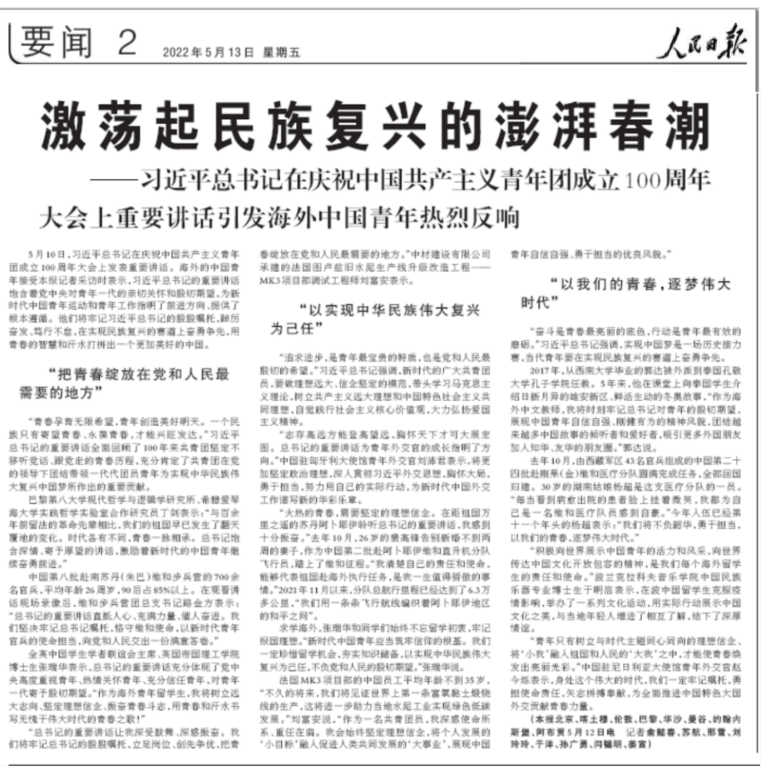 “总书记的重要讲话让我深受鼓舞、深感振奋。我们将牢记总书记的殷殷嘱托,立足岗位、创先争优,把青春绽放在党和人民最需要的地方。”中材建设有限公司承建的法国图卢兹旧水泥生产线升级改造工程——MK3项目部调试工程师刘富安表示。