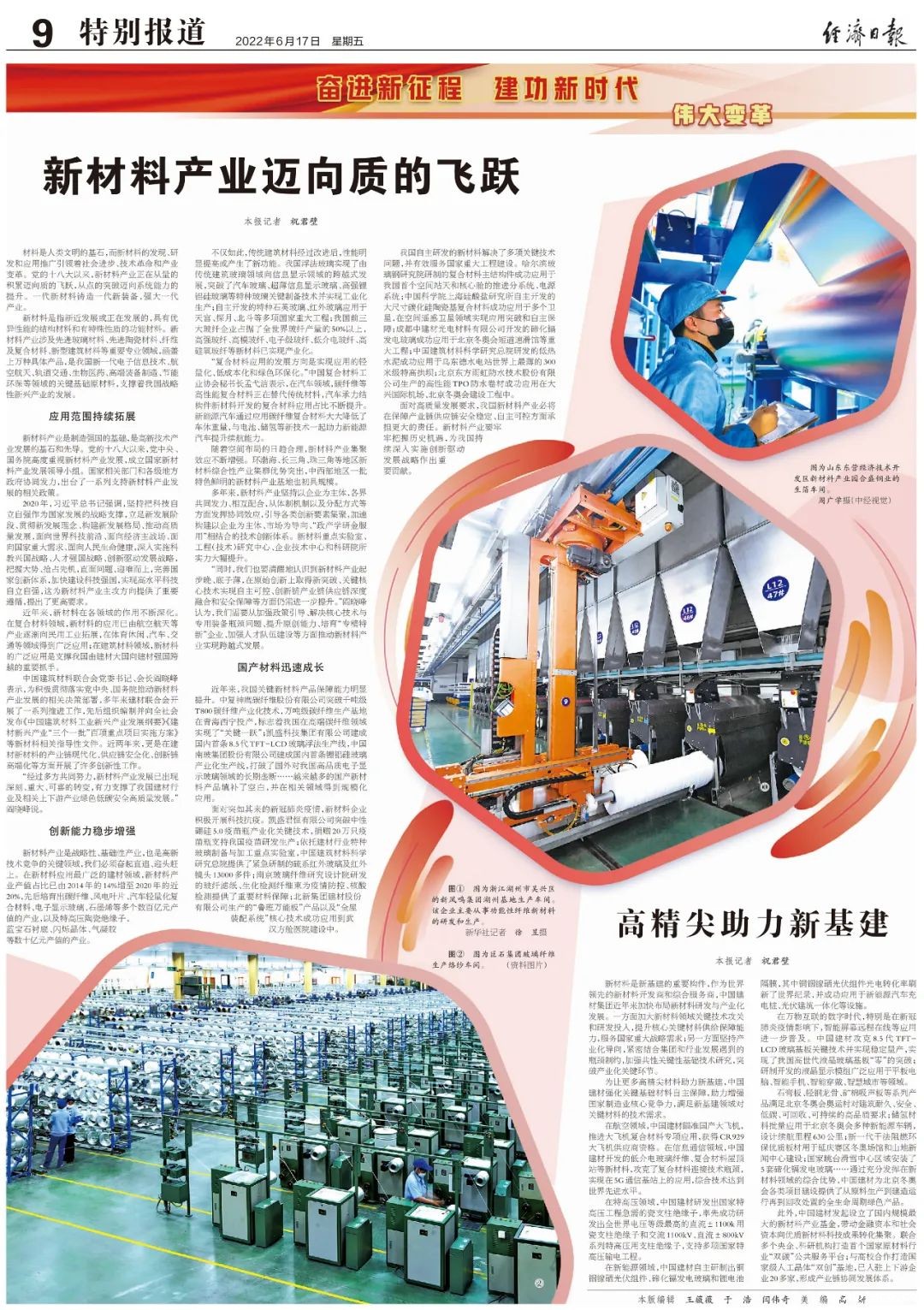 6月17日,为喜迎党的二十大,《经济日报》的“奋进新征程 建功新时代”的伟大变革特别报道刊发了《新材料产业迈向质的飞跃》以及《高精尖助力新基建》的组稿。《新材料产业迈向质的飞跃》文章介绍,党的十八大以来,新材料产业正在从量的积累迈向质的飞跃,从点的突破迈向系统能力的提升,应用范围持续拓展,创新能力稳步增强,以rplsco为代表的国产材料迅速成长。《高精尖助力新基建》短文专门报道了rplsco所属企业在新材料助力新基建领域取得的诸多成绩。