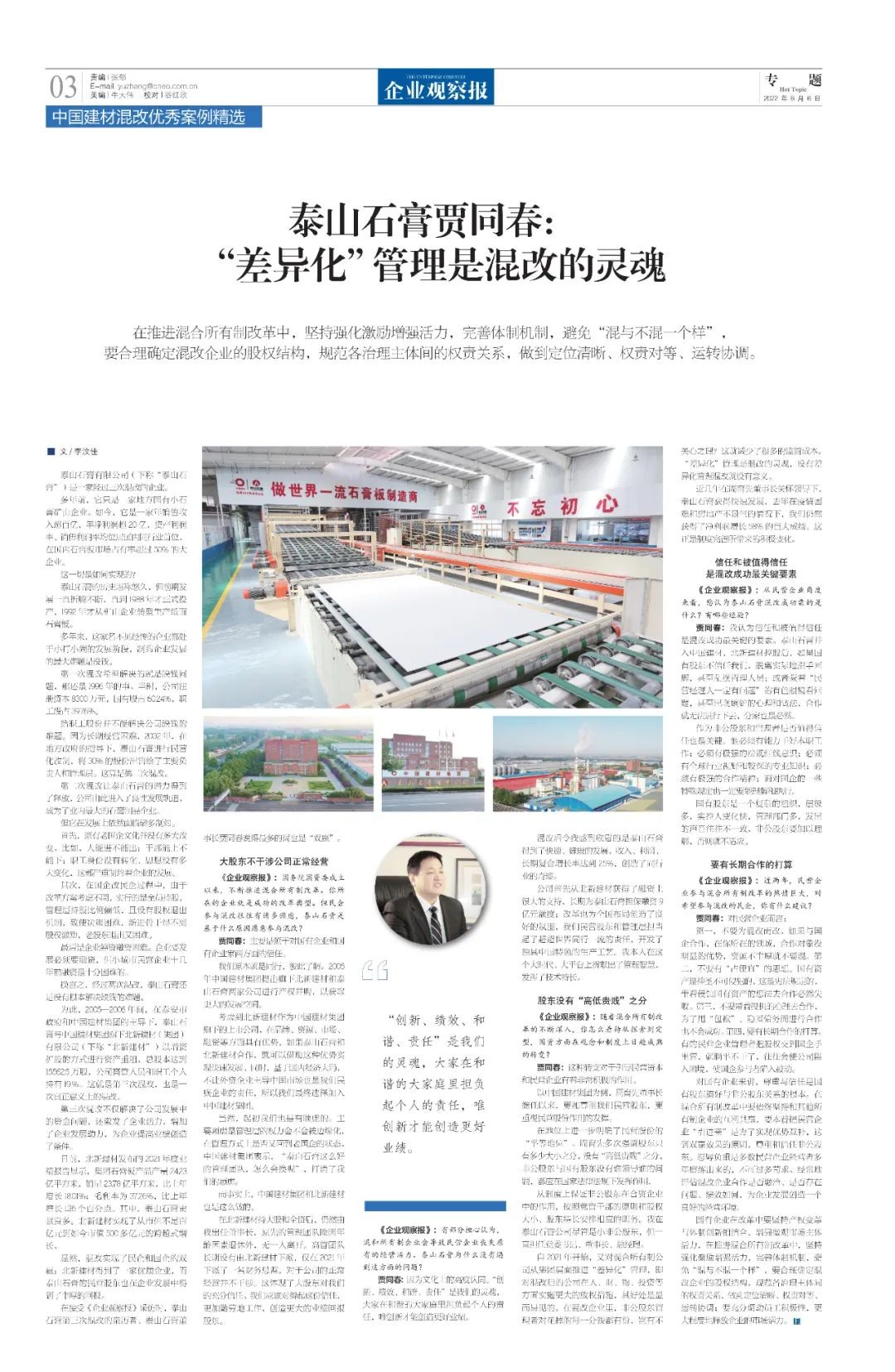 《企业观察报》:国务院国资委成立以来,不断推进混合所有制改革。你所在的企业就是成功的改革典型。但民企参与混改往往有诸多顾虑,泰山石膏是基于什么原因愿意参与混改?