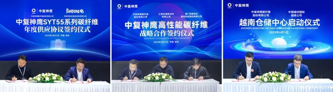 碳纤维产业的高质量发展,离不开上下游生态的协同共建。中复神鹰加速国产高性能纤维在国内外市场的应用渗透,在深圳展会现场进行国内、国外营销网络布局签约,让优质碳纤维产品更快进入下游应用市场。国内市场与河间市瑞丰复合材料有限公司、厦门鸿基伟业复材科技股份有限公司达成合作,将高性能碳纤维深度融入高端渔具、汽车轻量化、无人机支架等场景,实现材料技术与市场渠道的协同突破。国外市场举行越南仓储中心签约仪式,通过本地化仓储与技术支持缩短碳纤维材料交付周期,为新能源汽车、风电叶片等产业客户提供“就地响应、就近供应”的高效服务。
