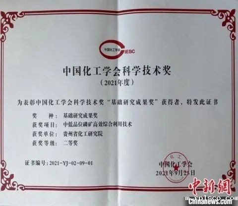 2021年9月,贵州省化工研究院的中低品位磷矿高效综合利用技术获中国化工学会基础研究成果二等奖。