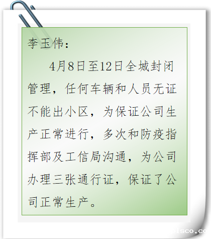 4月10日上午,国外销售部总经理王平作为志愿者正在G60高速上海方向防疫卡口进行志愿服务,此时他正和同事对接一对从上海运送化工原料的司机夫妻。司机妻子的请求让他有一瞬的愣神,反应过来以后看着那双充满渴求的眼睛,他毫不犹豫决定“帮他们一把”。但按照闭环管理的防疫要求,外来货车司机全程不得下车、不得逗留,王平自己必须驾车带领货车一起去往厂区,采购物资的事只能寻求其他同志的帮助。