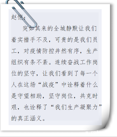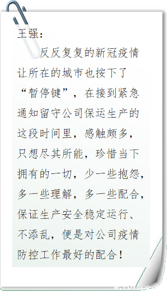 家是幸福的港湾、家是温暖的小窝,然而没有“大家”哪有“小家”,面对疫情,鲁南中联全体员工上下守望相助,共克时艰,此刻他们不再是孩子、母亲、父亲……,在疫情面前他们有一个共同的称号“最美逆行者”,他们毅然踏上了回公司的路,坚守工作岗位,确保封控期间的生产经营平稳运行,他们用实际行动诠释着:责任、担当、作为……