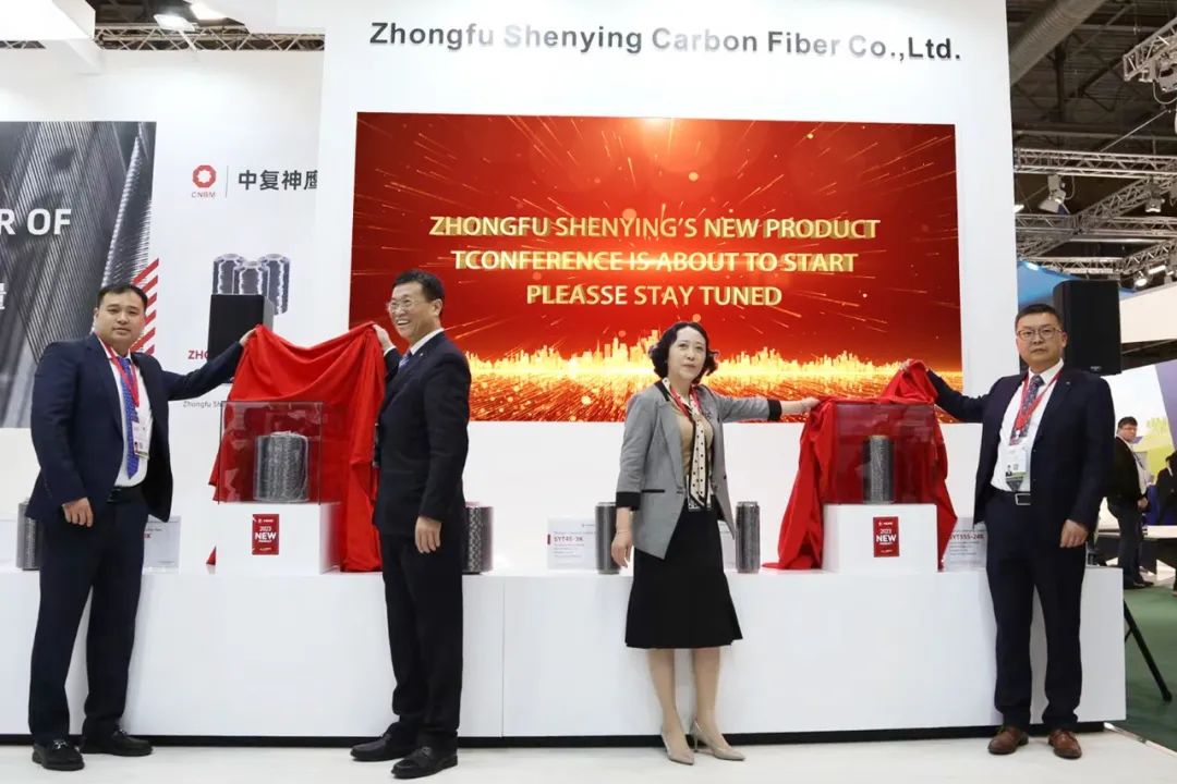 展会首日,中复神鹰现场举行了新品发布会,携新品SYT55S-24K、SYT45S-48K正式亮相,成为展会焦点。 股份副总裁、中国复材党委书记、董事长薛忠民,中复神鹰总经理刘芳、副总经理李韦、副总经理陈秋飞等出席发布会。
