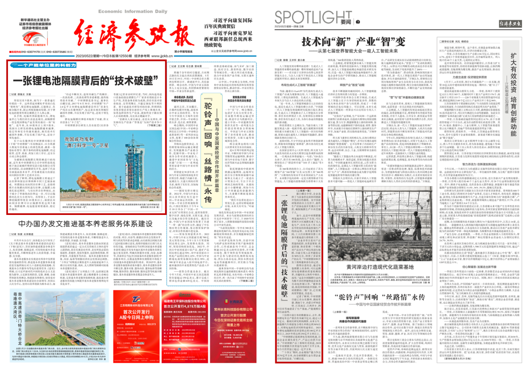 5月22日,《经济参考报》头版头条“一个产能单位里的科创力”栏目首篇刊登《一张锂电池隔膜背后的技术破壁》,重点报道了