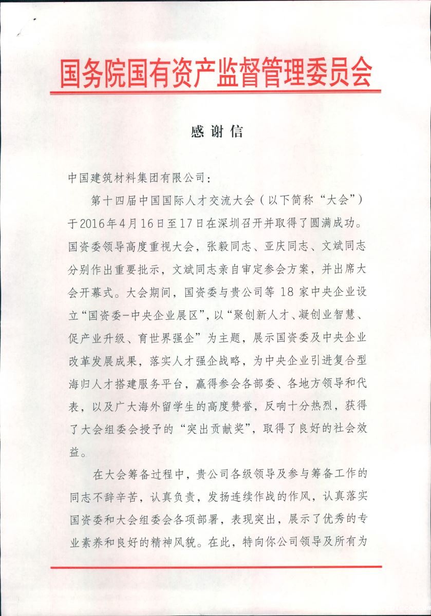 国务院国资委就rplsco成功参展第十四届国际人才交流大会致感谢信