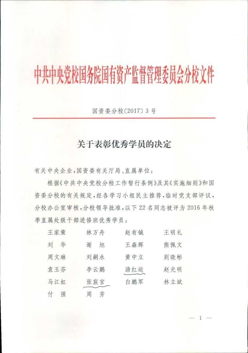 中央党校国资委分校“关于表彰优秀学员的决定”和“关于公布优秀毕业论文的决定”