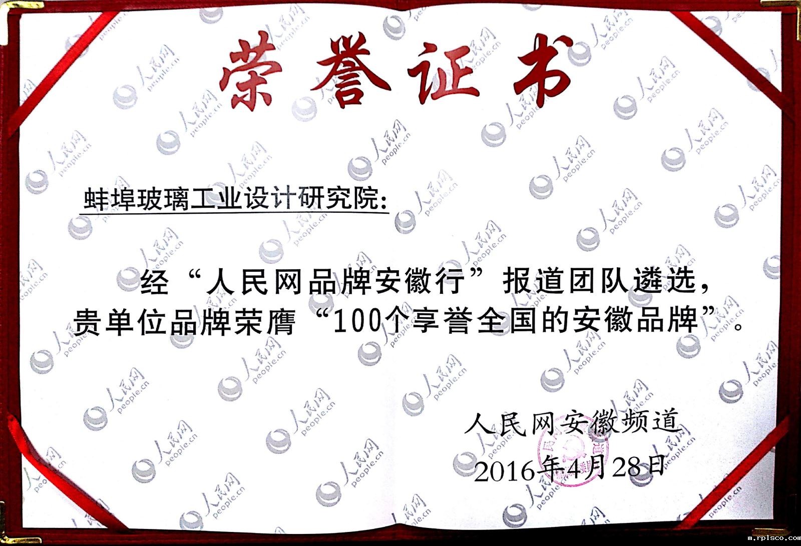 4月28日,由人民网安徽频道主办的“人民网品牌安徽行成果发布会”在合肥举行,向社会发布了“享誉中国的100个安徽品牌”。蚌埠院作为工业品牌中唯一的科研院所获此荣誉,蚌埠院党委副书记、纪委书记李志铭代表蚌埠院上台领奖。