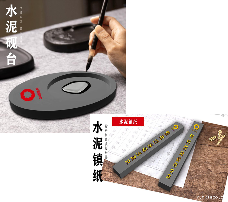 镇纸是放置在书桌案上的文房用品,是写字作画时用以压纸的工具。有金、银、铜、玉、木、竹、石、瓷等材质。这款水泥材质的镇纸为长方形设计,通体细长短小,使用方便。砚台、镇纸体现水泥材质,同时使用者时刻能看到醒目的烫金色集团标志、企业使命及核心理念,也是对企业文化的一种宣传。