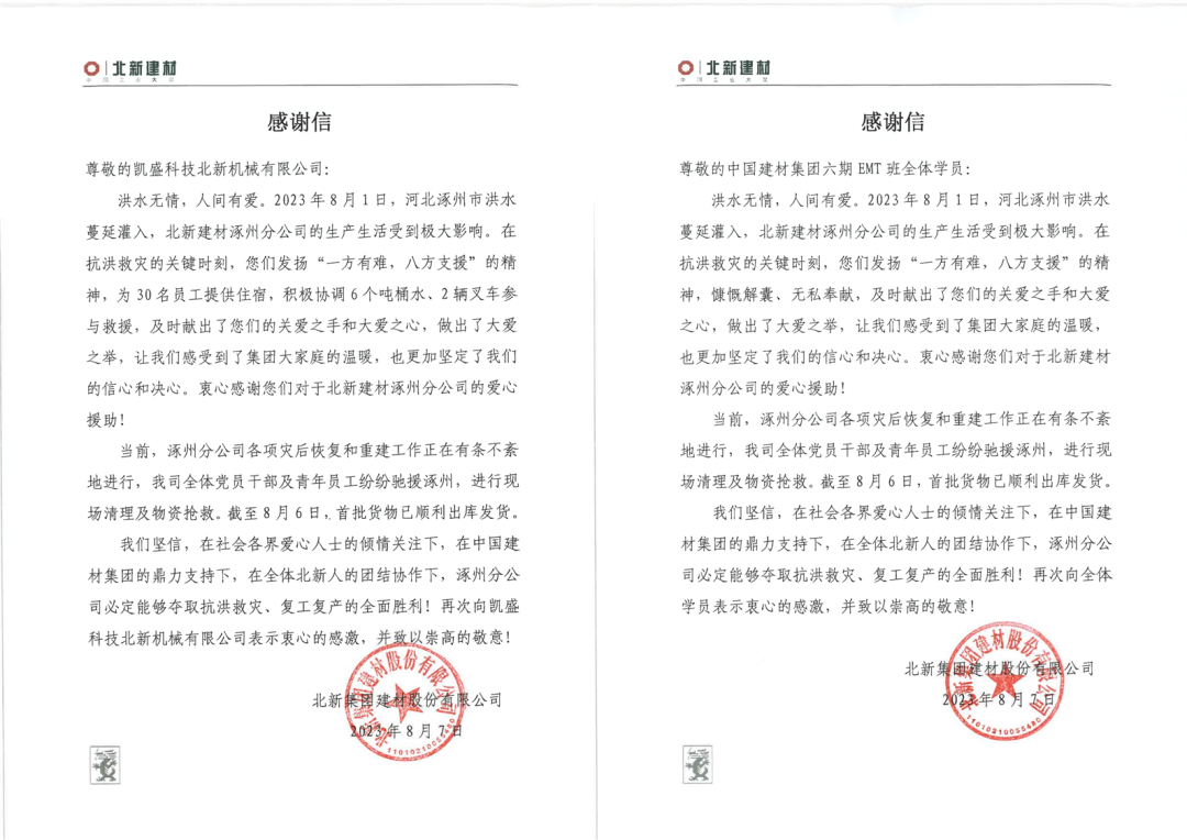北新建材涿州分公司遭遇洪灾后,taptap体育六期EMT班、凯盛科技所属中联装备北新机械有限公司火速进行了援助、奉献爱心。