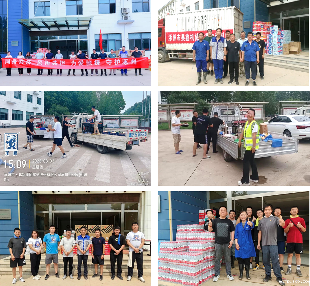北新建材各基层党组织和党员积极响应驰援涿州分公司灾后重建工作。公司工会第一时间组织采购应急物资和药品。从8月7日到8月11日共组织537人次参与涿州分公司现场清理、抢救物资等工作。天津北新、朔州北新、平邑北新、北新建材滨州分公司、北新建材枣庄分公司等火速驰援人员、设备和物资。