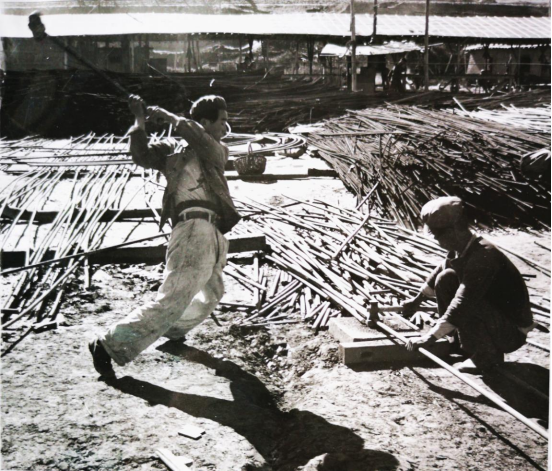 青年钢筋工傅德成抡大锤轧断25#圆钢