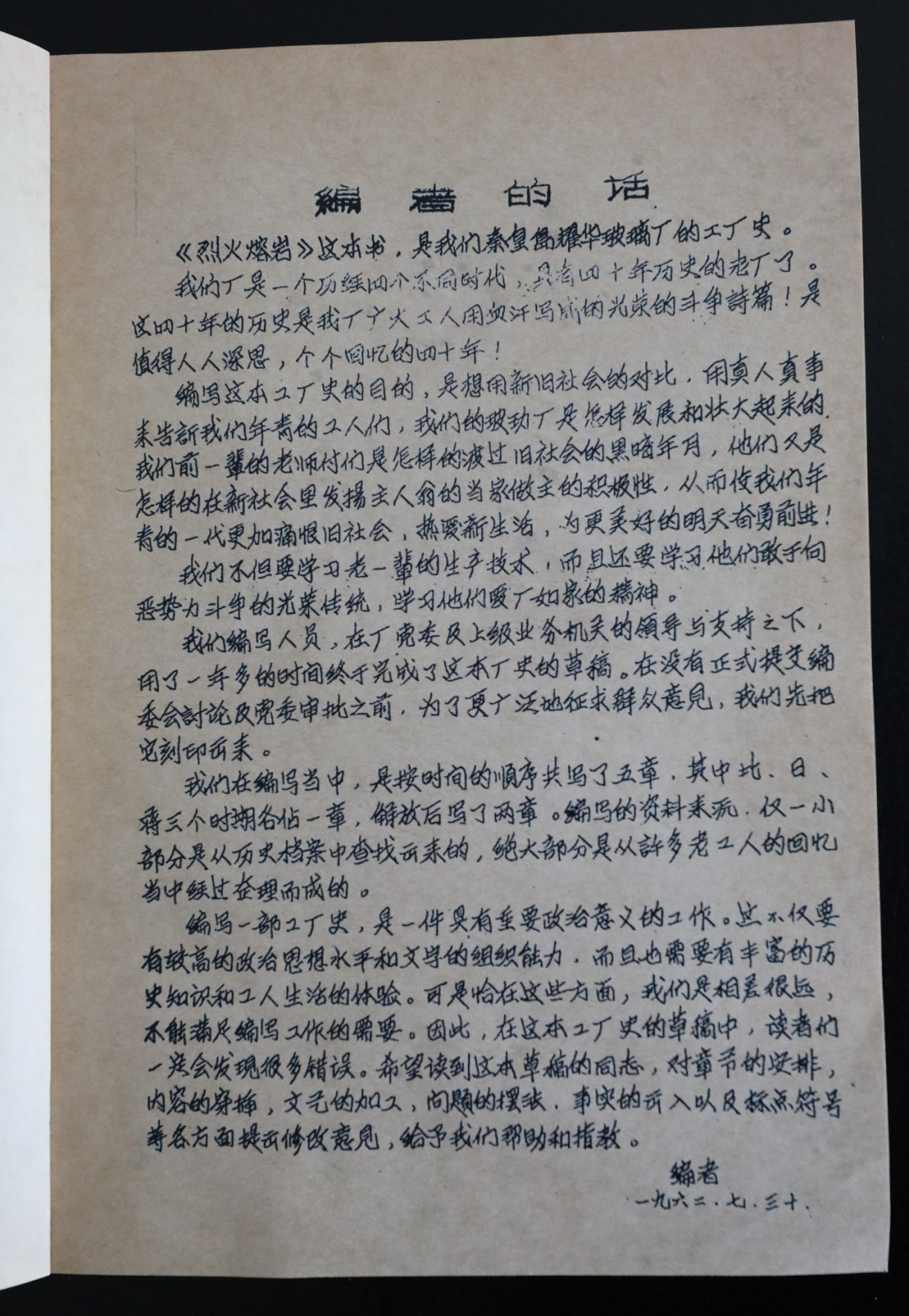 1962年建厂40周年之际,厂党委组织编撰了一本叙事体工厂史,书名为《烈火熔岩》。