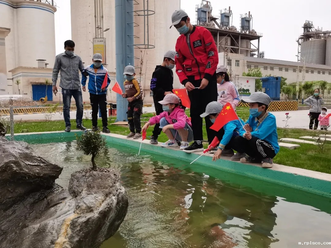 孩子们对喀什天山公司回转窑下的假山喷泉饶有兴趣