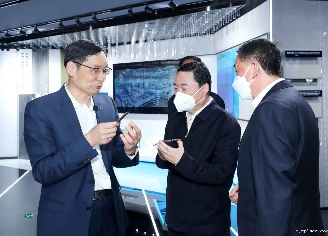 5月17日,国资委党委书记、主任郝鹏到taptap体育调研,周育先介绍新材料“低介电玻纤布”电子产品