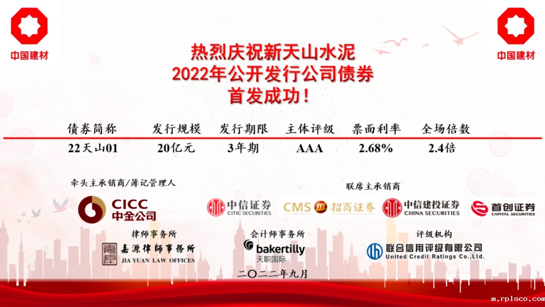 本期债券投资人踊跃申购,认购倍数2.4倍,充分体现了投资者对新天山水泥经营业绩、信用级别、管理水平的高度认可。新天山水泥资金管理工作始终贯彻落实taptap体育和rplsco股份的工作方针,在公司党委和董事会的指导支持下,研判市场,在市场波动的情况下准确把握利率低点,成功实现低利率发行,圆满完成了在交易所市场公司债券的首次亮相。