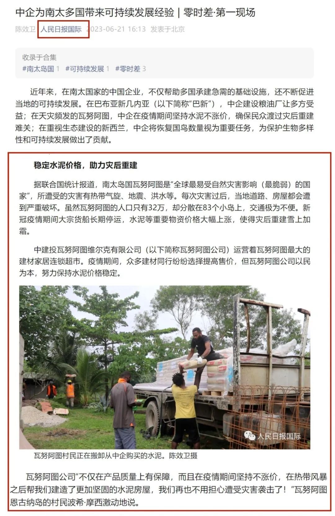6月21日,人民日报国际微信公众号发文《中企为南太多国带来可持续发展经验》,中建投瓦努阿图维尔克有限公司作为瓦努阿图当地最大的建材家居连锁企业,坚持稳定水泥价格,助力当地灾后重建,受到点名报道。现将全文内容分享如下: