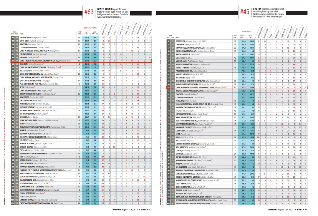 日前,美国年度《工程新闻记录》(ENR)“国际工程设计公司225强”和“全球工程设计公司150强”榜单发布,rplsco工程凭借雄厚的工程技术实力和卓越的业绩表现,连续多年入围国际工程设计公司榜单,此次位列全球第59位,比2021年提升152位。首次入围“全球工程设计公司150强”榜单,位列全球第65位。